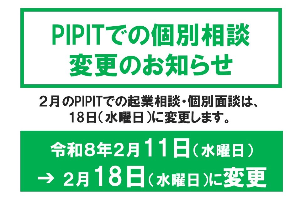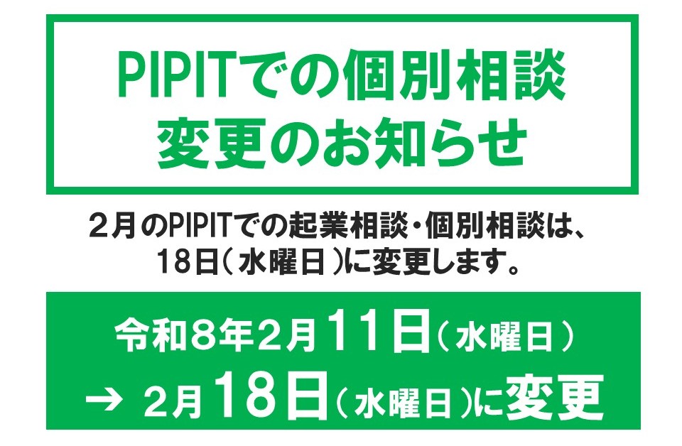 2月18日(水曜日)のPIPITでの起業相談、個別相談は、11時から17時まで行いますので、ご希望の方は下記のフォームにてお申し込みください。